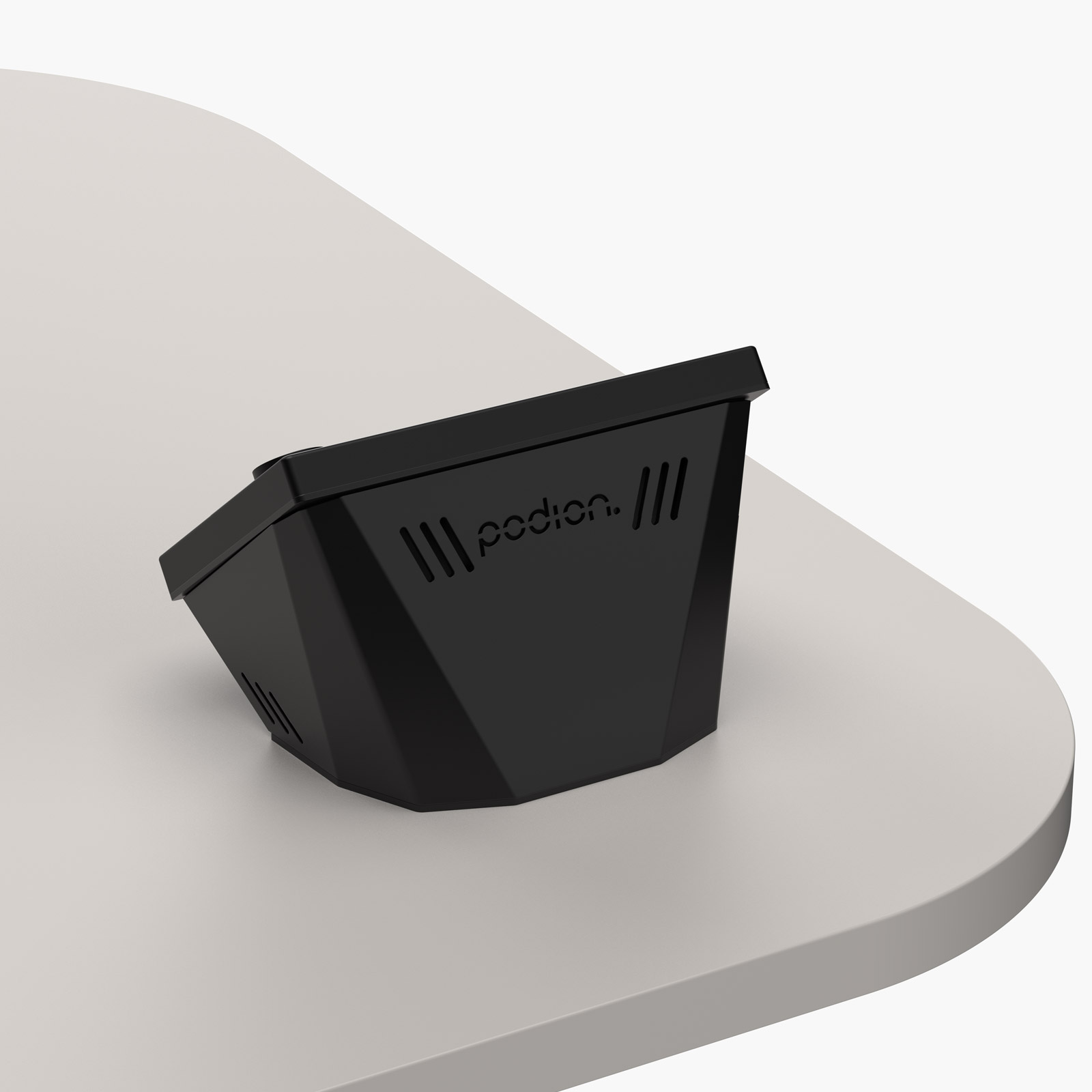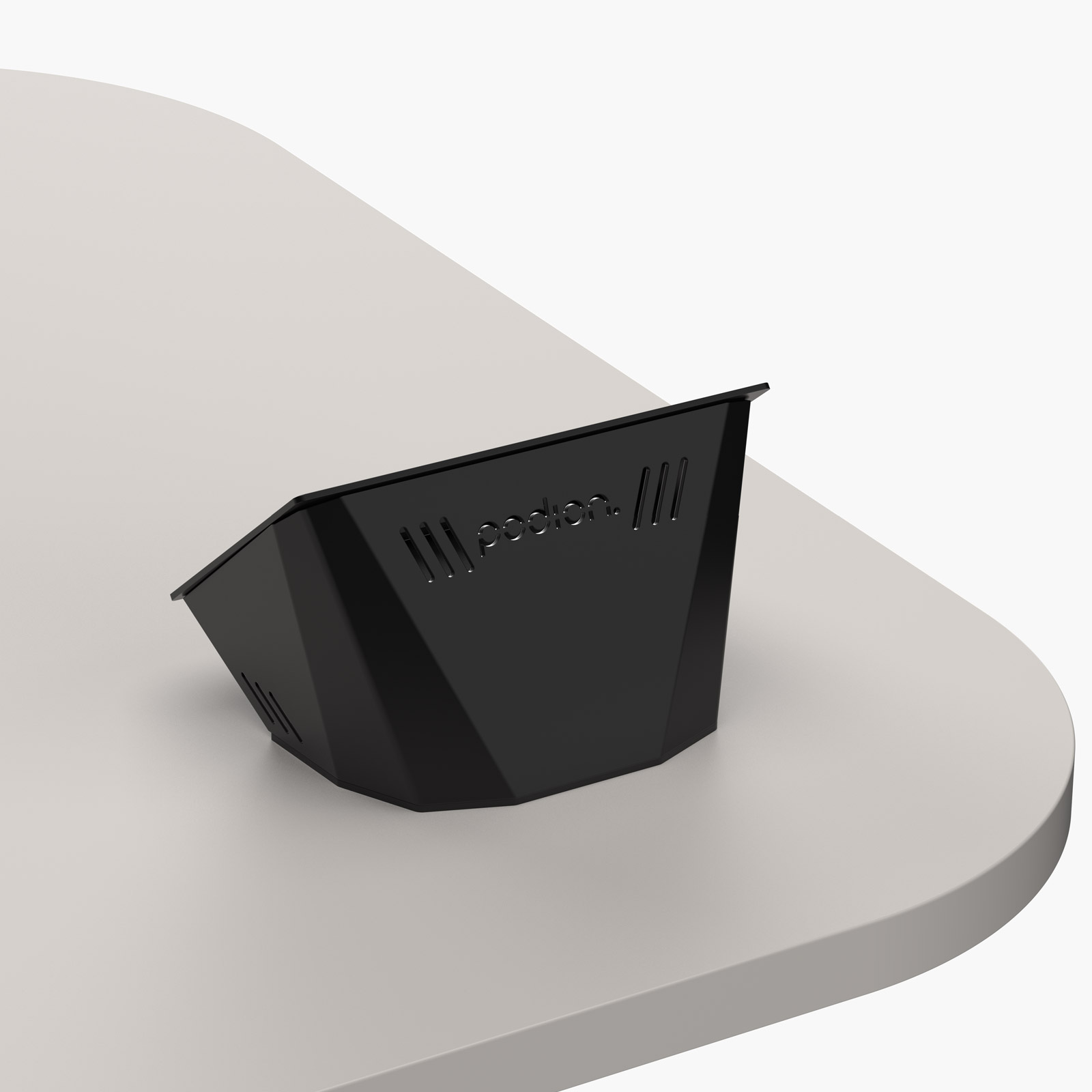 Cables are concealed within the housing and routed through the worktop, for a neat, integrated appearance. Ventilation perforations allow airflow around the control hardware during operation.