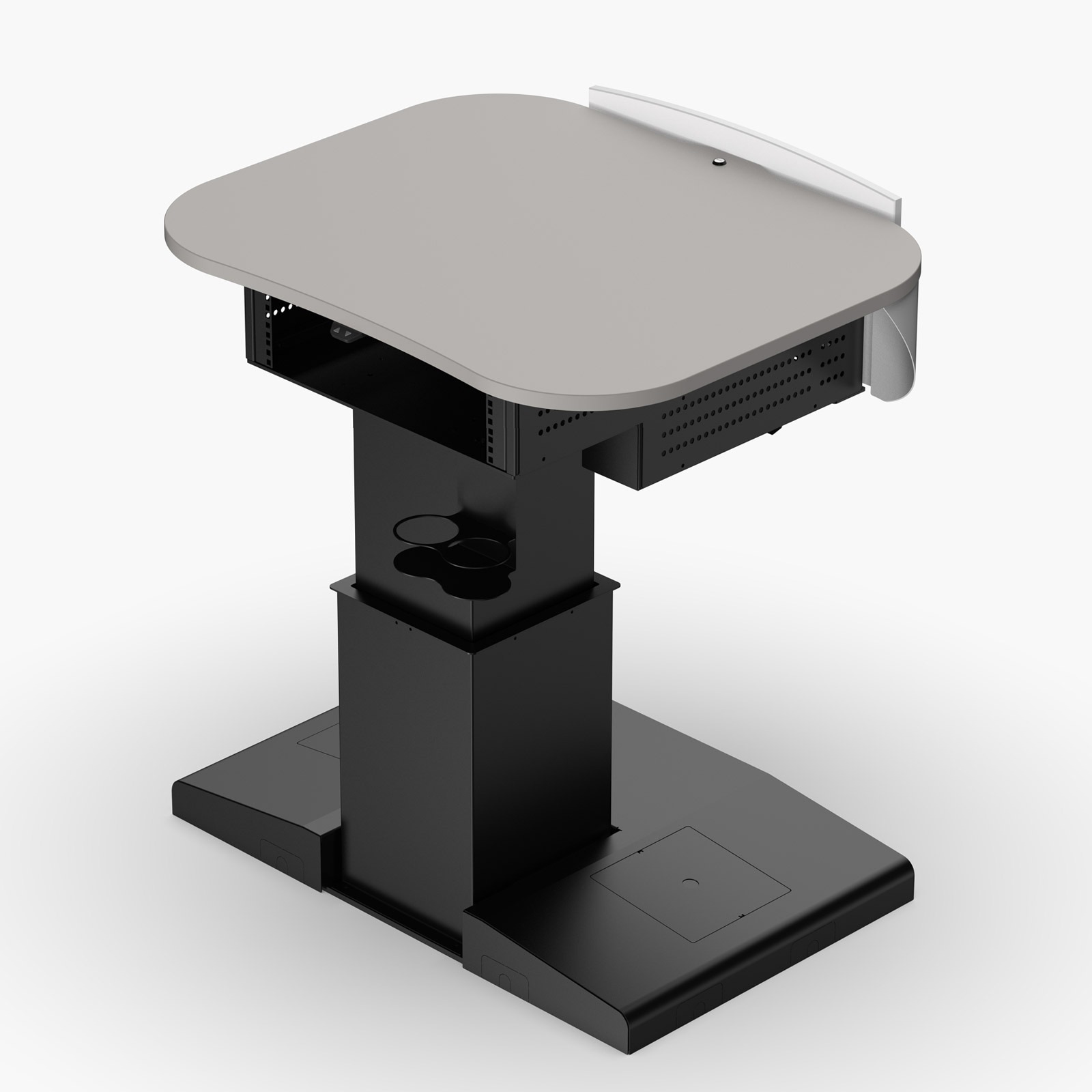 Our multimedia lecterns have an internal actuator built-in to the column that provides a 300mm height adjustment range.