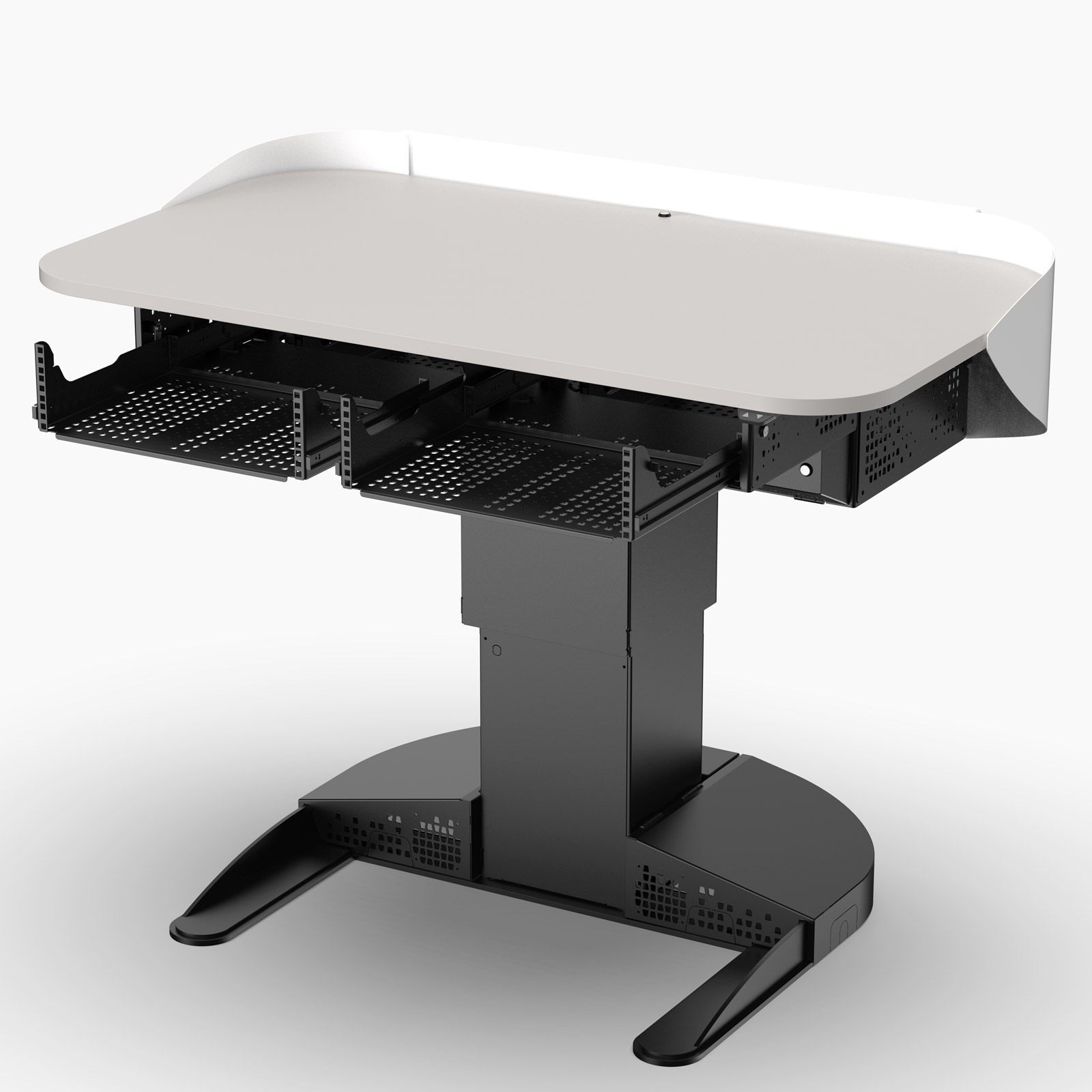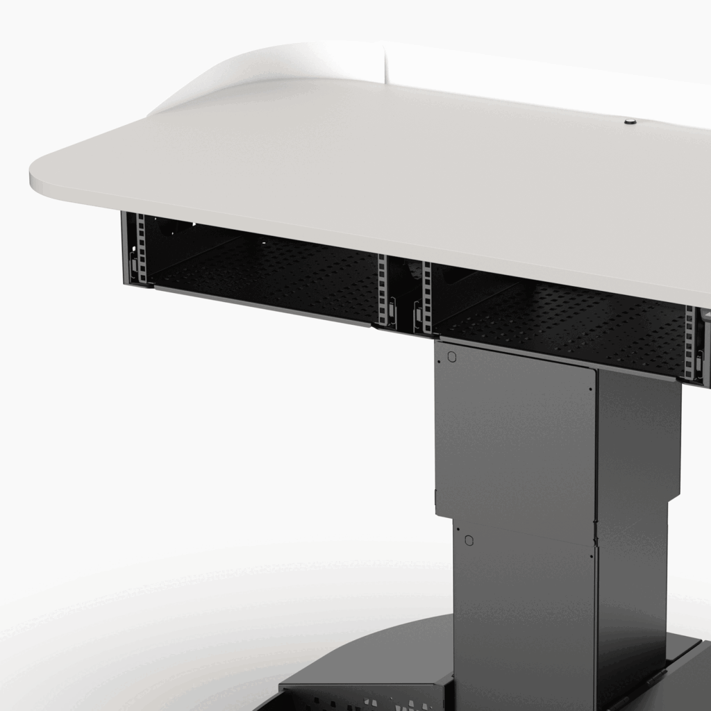 Multimedia lectern animation showing two 3ru rack trays sliding out for equipment access