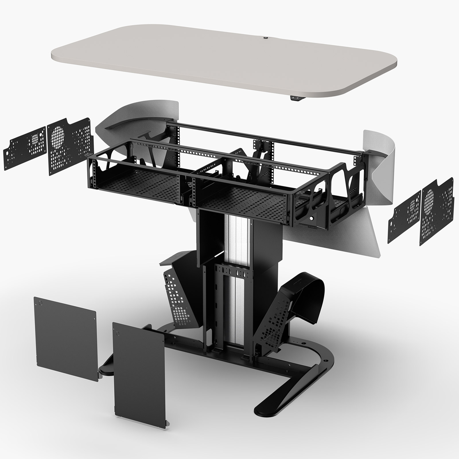 • Ergonomic worktop layout places AV devices comfortably within reach