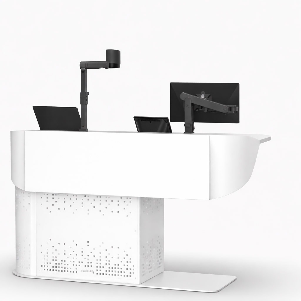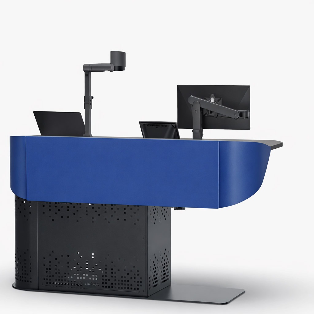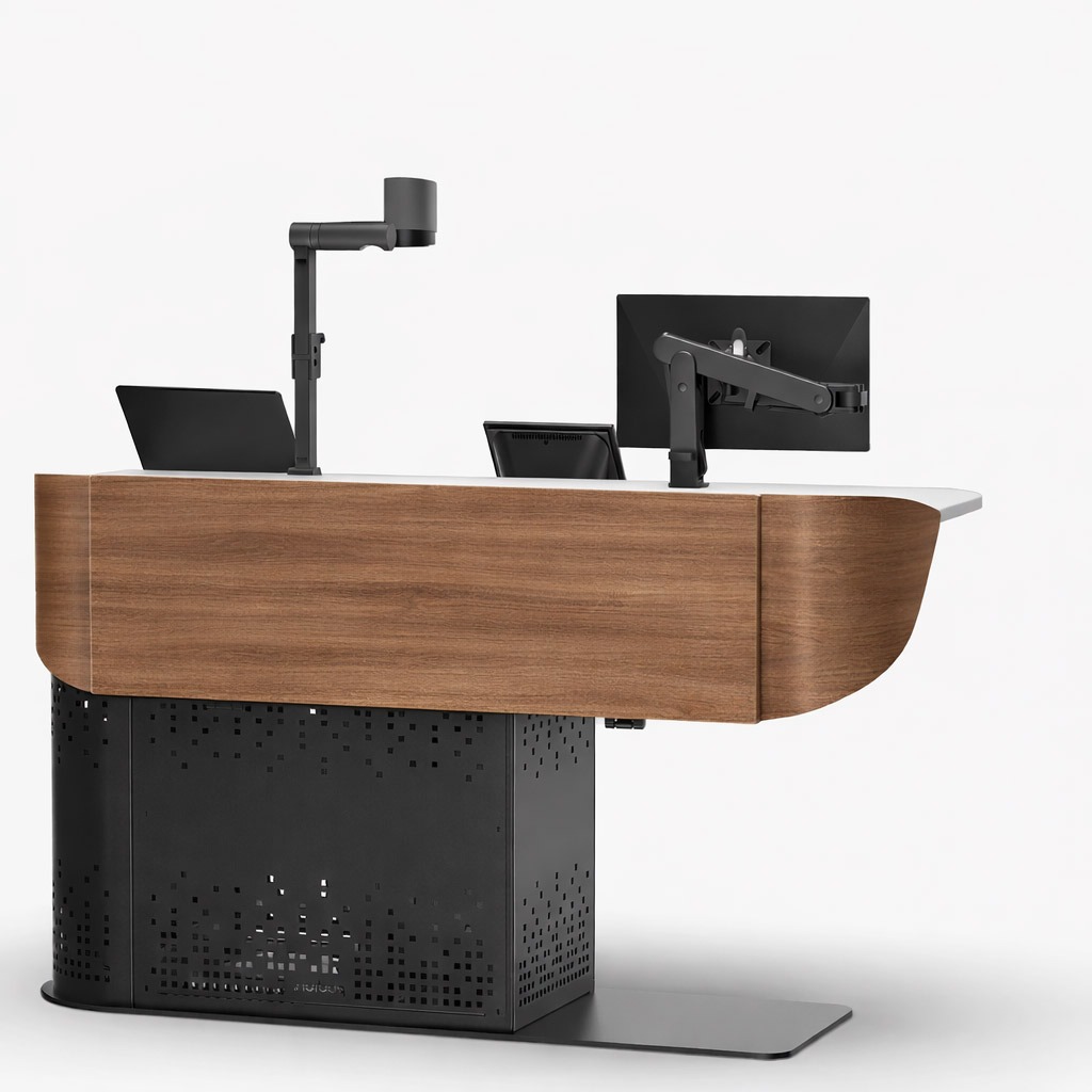 Electric height adjustment – with optional battery power – allows all presenters to work comfortably, while the open roll-in base and generous knee clearance provide equal access to controls and devices. The spacious worktop supports integrated displays and control interfaces, creating a clear, organized working surface.