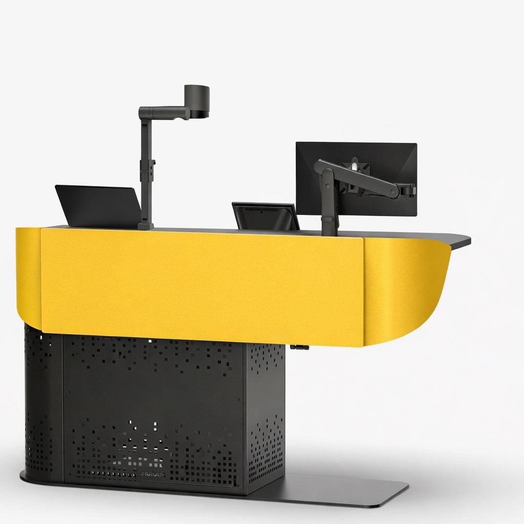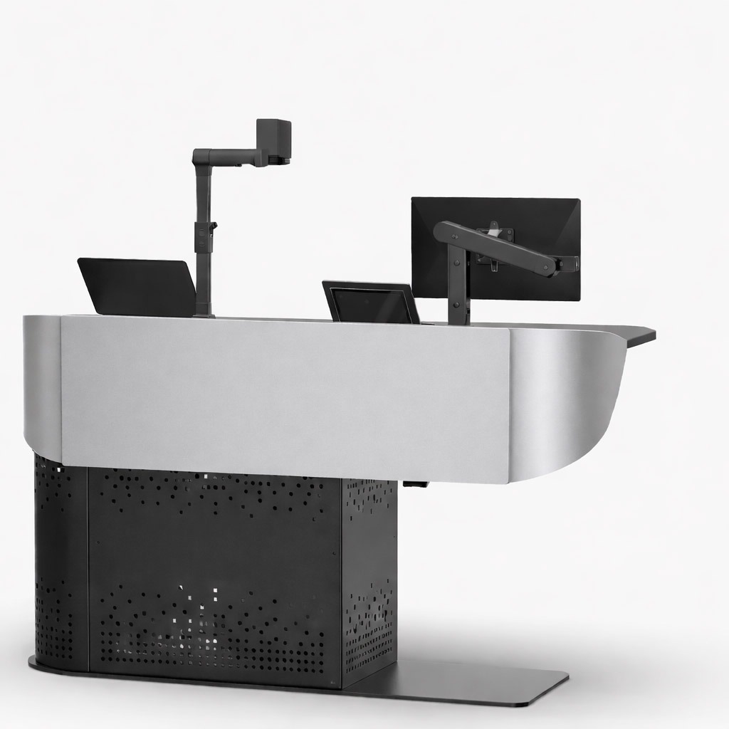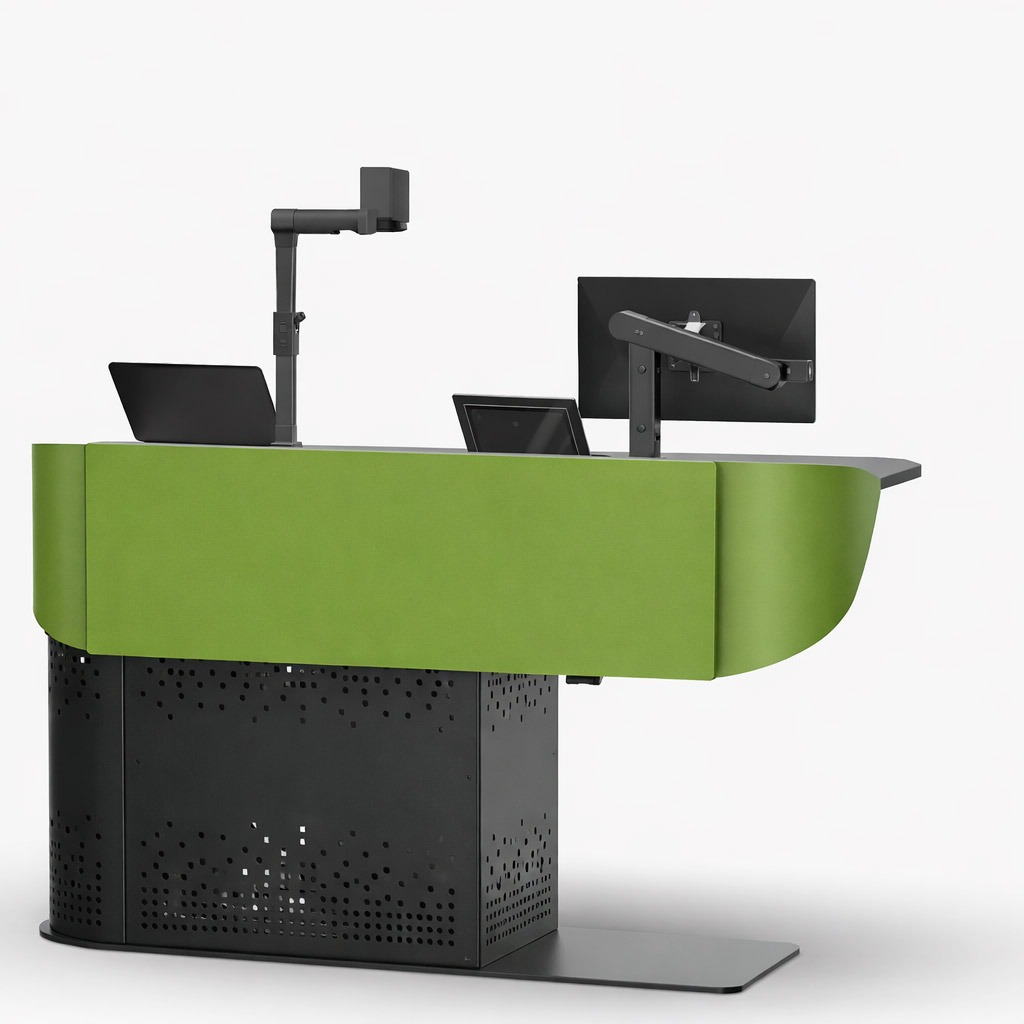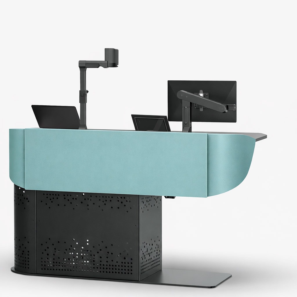 Electric height adjustment – with optional battery power – allows all presenters to work comfortably, while the open roll-in base and generous knee clearance provide equal access to controls and devices. The spacious worktop supports integrated displays and control interfaces, creating a clear, organized working surface.