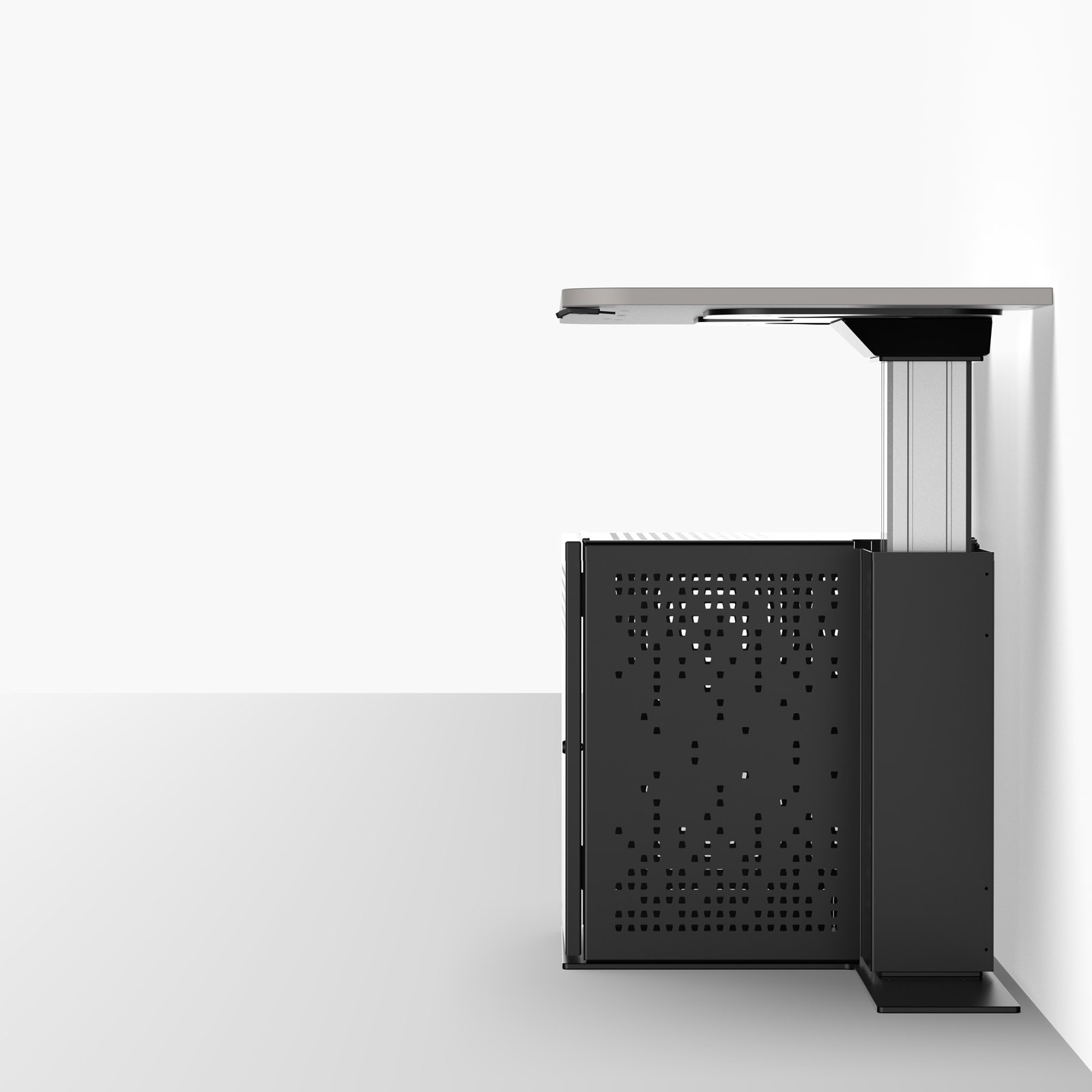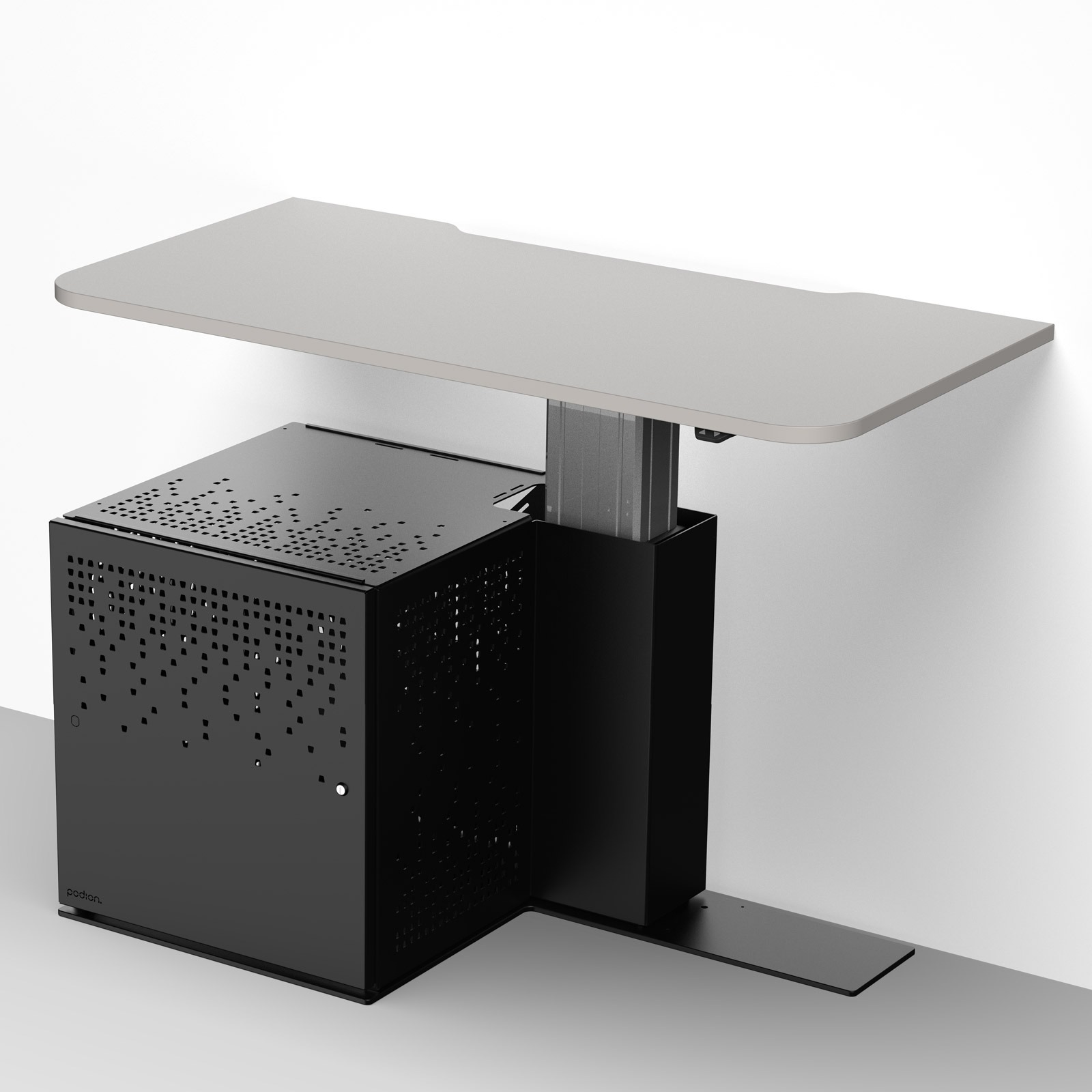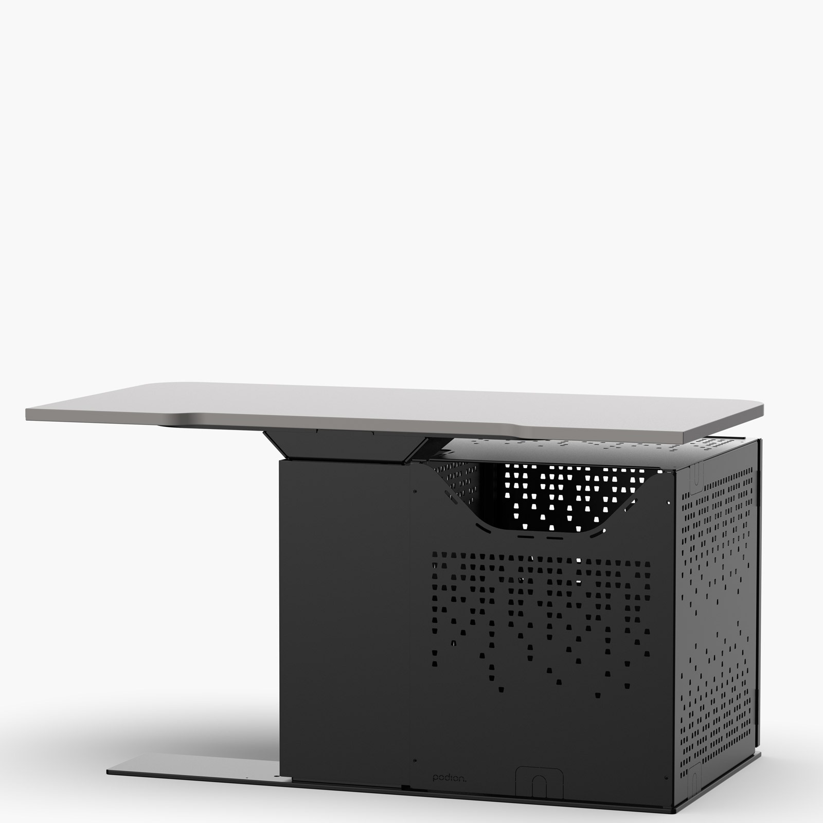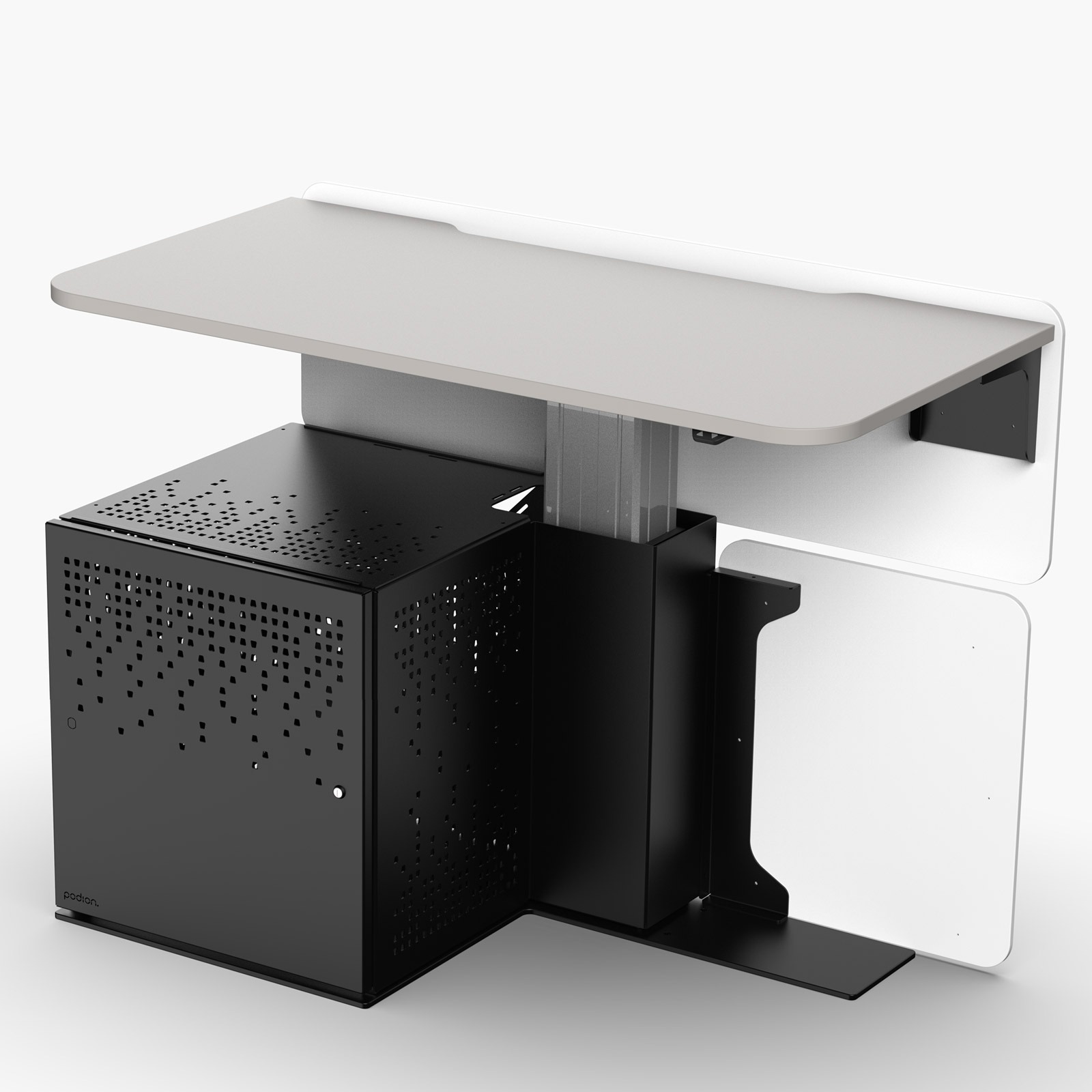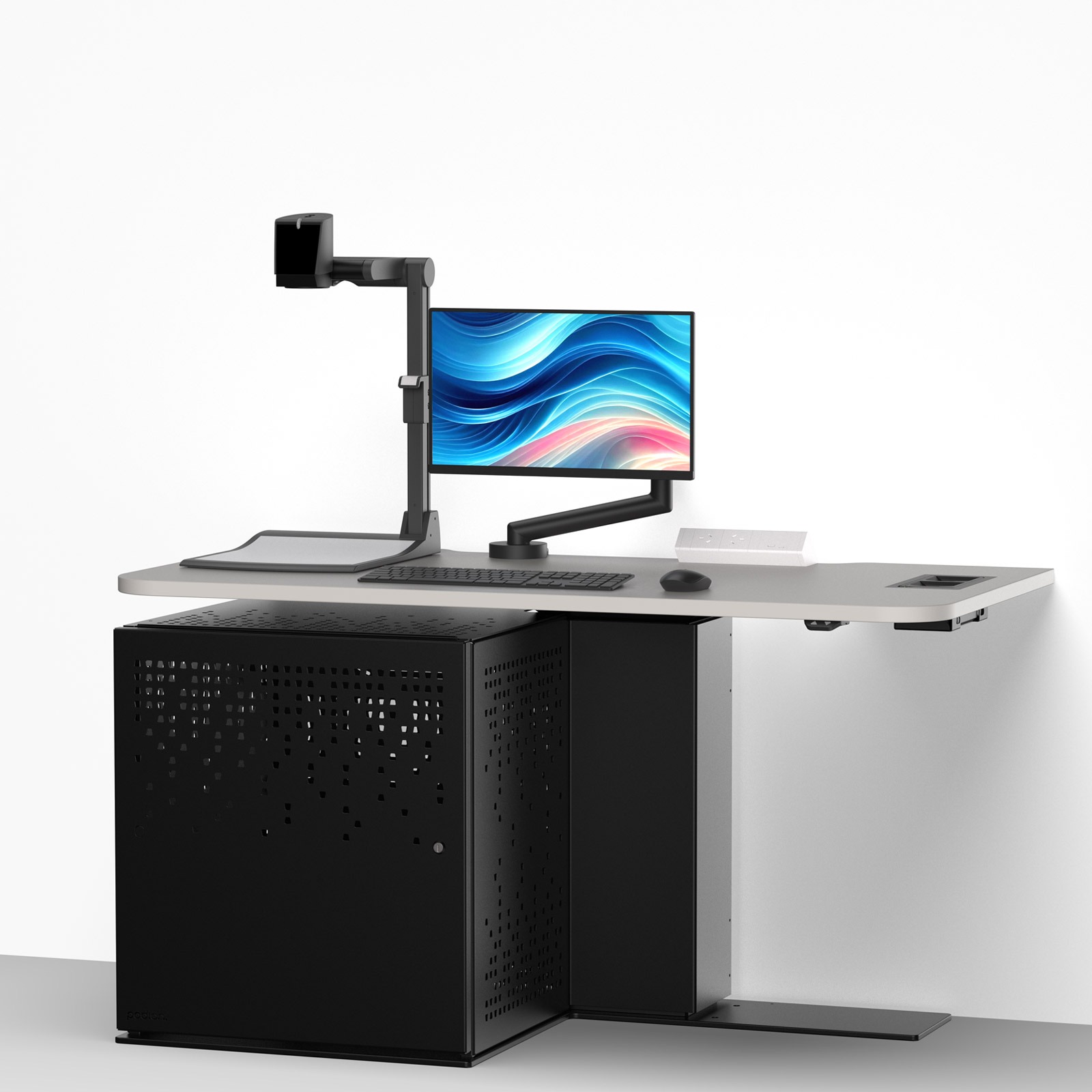 A height-adjustable, wheelchair-inclusive multimedia workstation, available as a wall-positioned teacher desk or with a logo and modesty panel for lectern use.