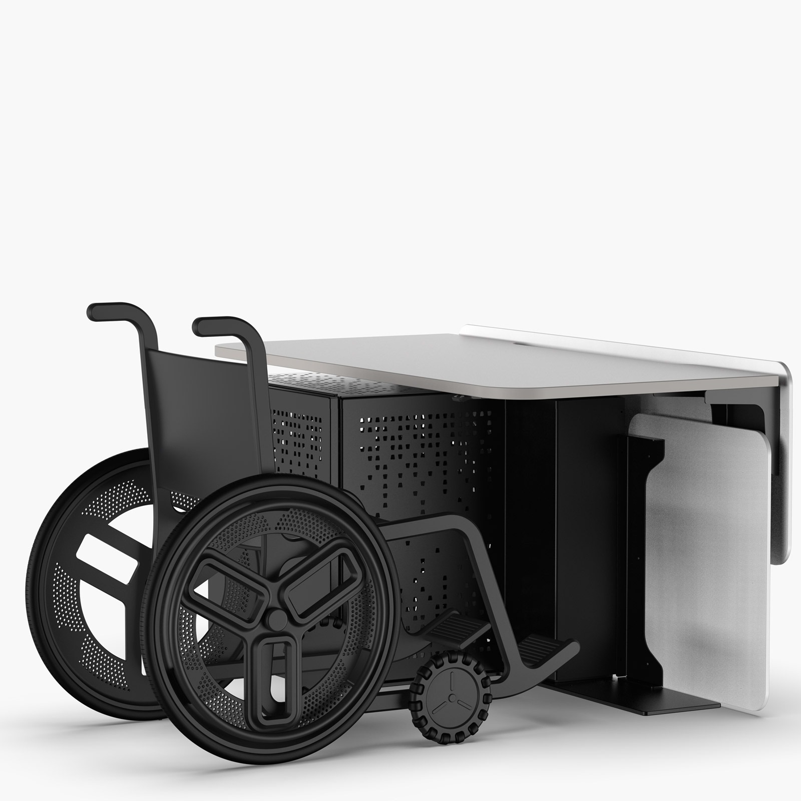 Its desk-like, open-front design allows a wheelchair user to roll in and out comfortably beneath the worktop, with height adjustment to suit different users and teaching styles.