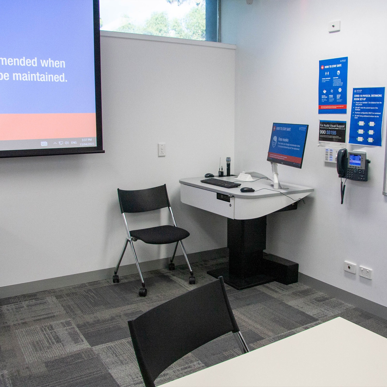 Unlike traditional lecterns, TDP-HA is positioned against a wall or in a corner to maximize usable floor space, making it ideal for teaching spaces where layout and mobility are key.