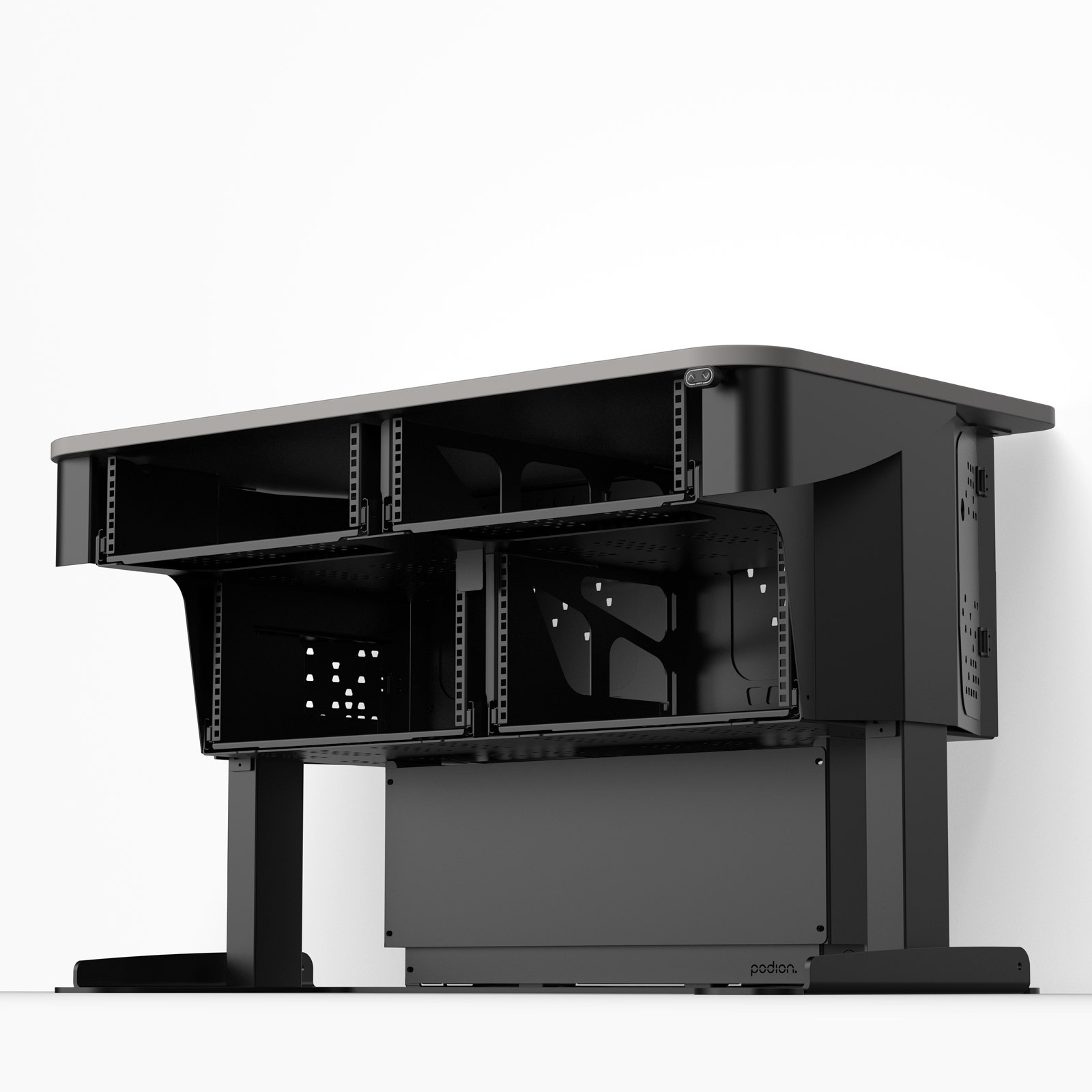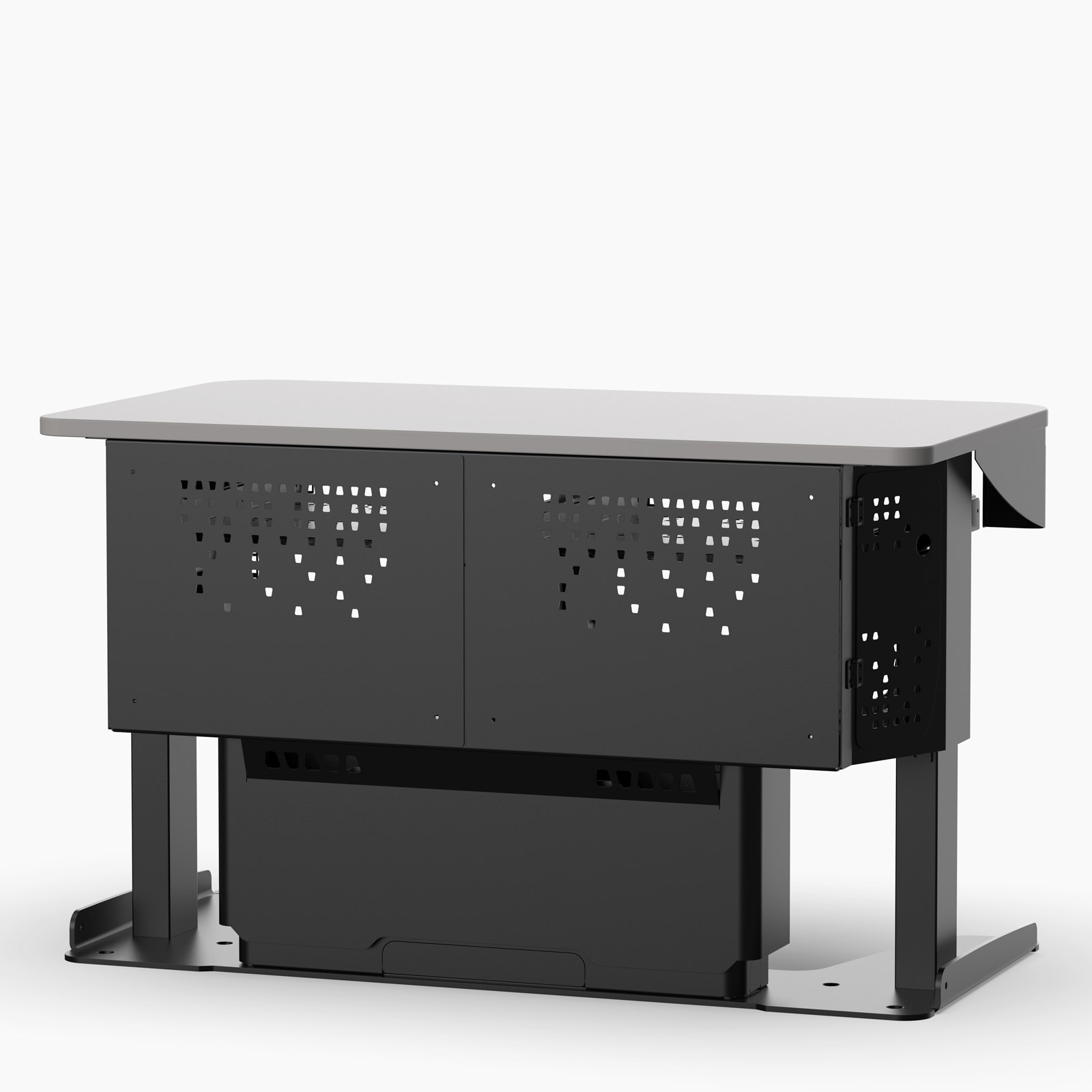Its desk-like, open-front design allows a wheelchair user to roll in and out comfortably beneath the worktop, with height adjustment to suit different users and teaching styles. Integrated AV controls provide a clear touchdown point for managing presentations and room systems, enabling the presenter to set up and make adjustments before moving away from the workstation to interact more directly with participants.
